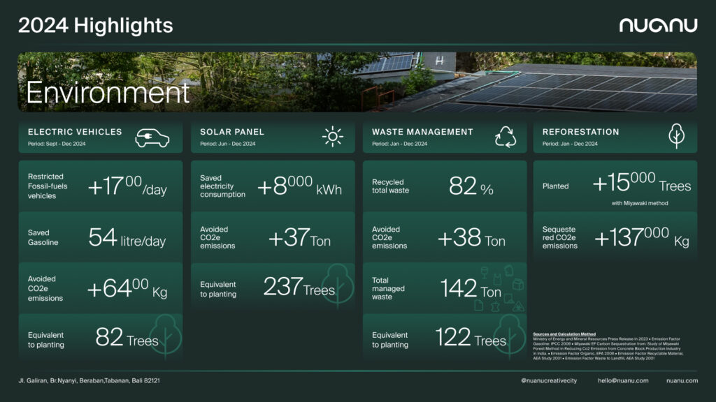Tahun 2024 adalah awal perjalanan transformasi bagi Nuanu, dan sejauh ini telah tercapai sejumlah pencapaian penting di bidang lingkungan, pemberdayaan sosial, dan pelestarian budaya. Pencapaian ini membangun momentum yang kuat untuk menyambut tahun 2025, dengan komitmen utama pada lingkungan, seperti menjaga 70% lahan sebagai ruang hijau dan mewajibkan setiap proyek untuk mengalokasikan 5% dari pendapatan kotornya ke Nuanu Social Fund (NSF) untuk mendukung transformasi sosial.