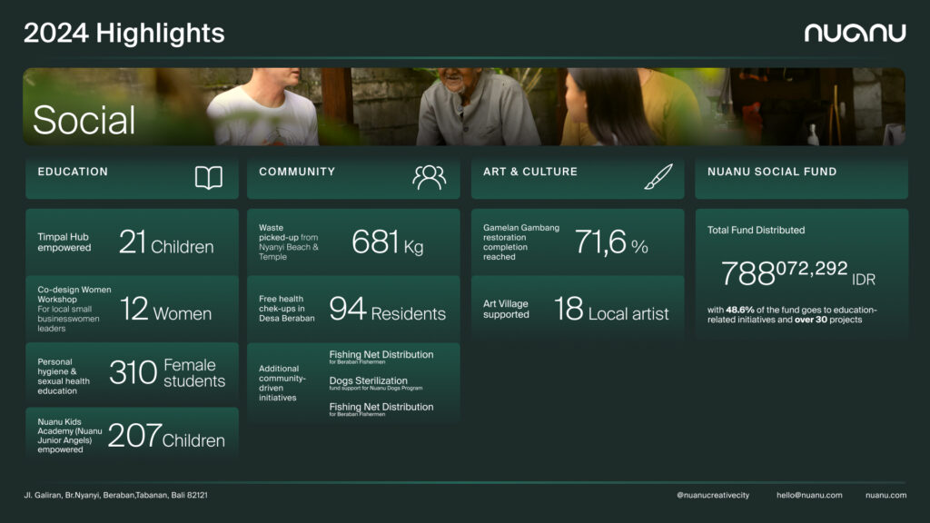 Nuanu mengadopsi model bisnis double bottom line, yang menunjukkan bahwa keberlanjutan finansial dan kontribusi sosial dapat berjalan beriringan. Dengan menyeimbangkan profitabilitas dan tujuan berdampak, Nuanu berkomitmen untuk membawa perubahan positif bagi masyarakat sekitar sekaligus mencapai pertumbuhan jangka panjang. Sepanjang tahun 2024, Nuanu telah menetapkan fondasi yang kuat melalui berbagai inisiatif sosial dan siap melangkah ke tahun 2025 dengan lebih banyak proyek inovatif dan inisiatif bermakna untuk mewujudkan visinya sebagai kota kreatif.